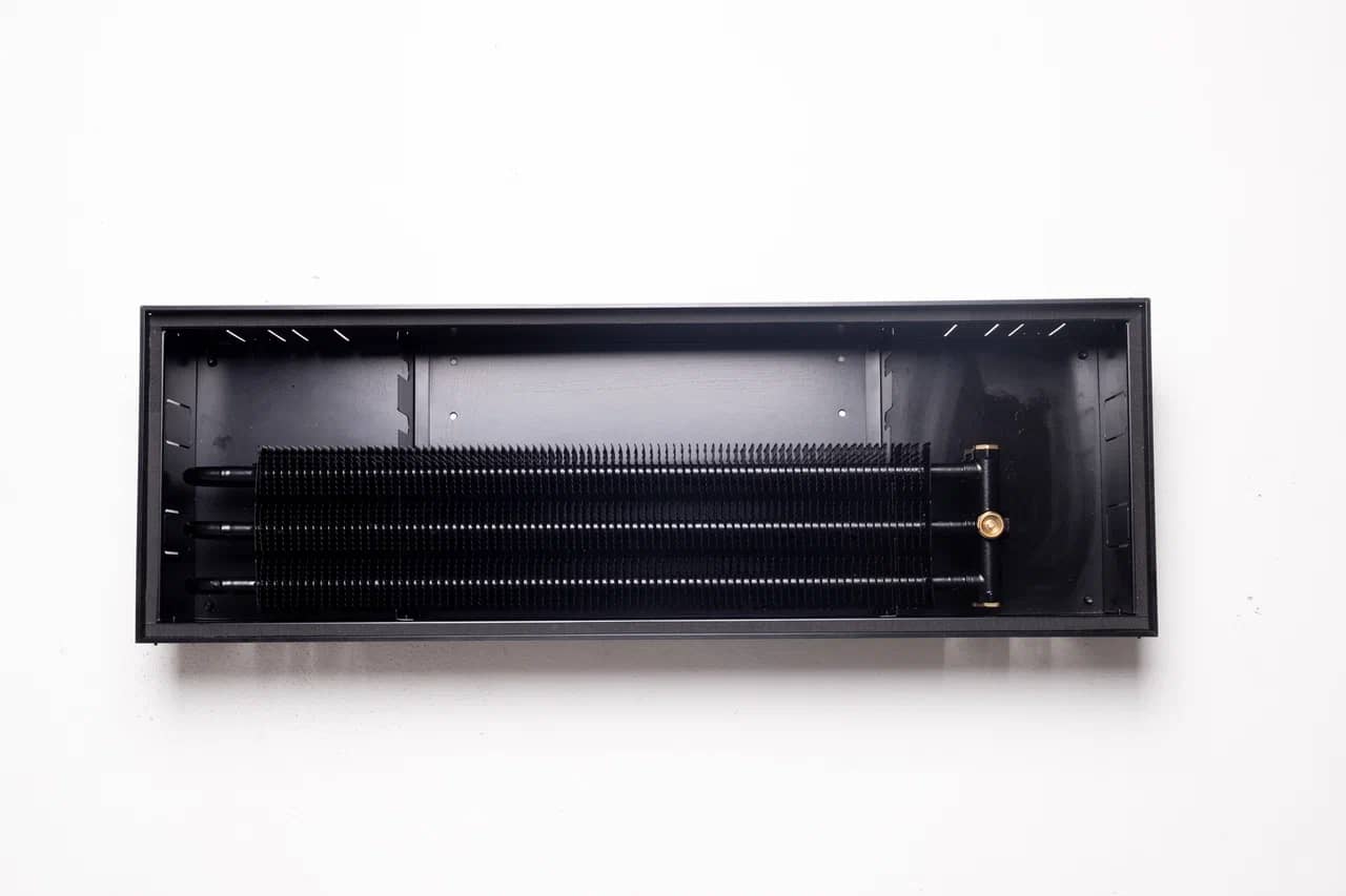 Для предотвращения коррозии все детали конвектора выполнены из высококачественной листовой оцинкованной стали с износостойким порошковым покрытием. Два типа профиля (U-образный и F-образный) декоративной рамки позволяют встраивать конвектор в любой тип пола. Тип профиля рамки не влияет на стоимость конвектора. Труба теплообменника выполнена из цельной медной трубы. Узел подключения с внутренней резьбой 1/2″ оборудован воздушным спускником.