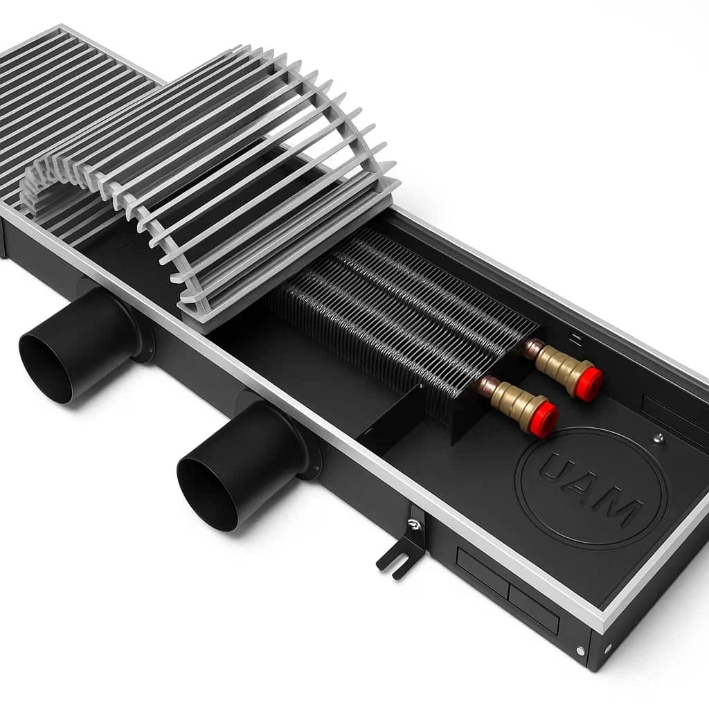 Для предотвращения коррозии все детали конвектора выполнены из высококачественной листовой оцинкованной стали с износостойким порошковым покрытием. Два типа профиля (U-образный и F-образный) декоративной рамки позволяют встраивать конвектор в любой тип пола. Тип профиля рамки не влияет на стоимость конвектора. Труба теплообменника выполнена из цельной медной трубы. Узел подключения с внутренней резьбой 1/2″ оборудован воздушным спускником.