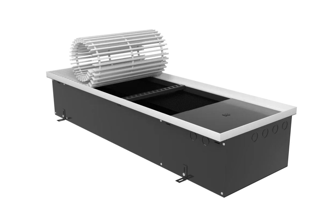Для предотвращения коррозии все детали конвектора выполнены из высококачественной листовой оцинкованной стали с износостойким порошковым покрытием. Два типа профиля (U-образный и F-образный) декоративной рамки позволяют встраивать конвектор в любой тип пола. Тип профиля рамки не влияет на стоимость конвектора. Труба теплообменника выполнена из цельной медной трубы. Узел подключения с внутренней резьбой 1/2″ оборудован воздушным спускником.